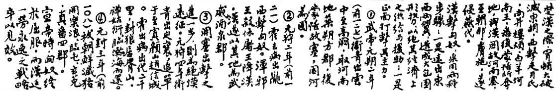 亦会其时汉多人才,大将最著者莫如霍去病。去病以皇后姊子,少贵,年十八为侍中。初从大将军卫青出塞,为票姚校尉,与轻勇骑八百直弃大军数百里赴利,斩捕首虏过当,遂封侯,时为元狩六年,去病年二十三。其后屡以敢深入建奇功。匈奴浑邪王谋降汉,武帝“恐其诈。”命去病将兵往迎。去病渡河,与浑邪众相望。浑邪见汉军而多不欲降,颇遁去。去病乃驰入匈奴军,得与浑邪王相见,斩其欲亡者八千人,独遣浑邪王乘传先诣行在所,尽将其众渡河,降者四万。时为元狩二年,去病年二十五。史称去病为人少言,有气敢往。武帝尝欲教之孙、吴兵法,对曰:“顾方略何如耳,不至学古兵法。”帝为治第,令视之,曰:“匈奴未灭,无以家为。”其卒在元狩六年,时年二十九也。“观去病之将兵,较之项王未多逊。故唐人诗“借问汉将谁?恐是霍票姚”,独数其人,非虚也。时李广亦称名将,卫、霍皆以亲贵任用,而李广则为豪杰从军。(时称“良家子”从军,即今之义勇队也。)卫、霍虽以女宠进,而重以建功绝域自显,其一种进取勇决无畏之风,亦可敬矣。惟当时亲贵与豪杰判为两党,卫、霍虽贵盛,豪杰不之重;李广父子愈摈抑,豪杰亦愈宗之。史公亲罹其祸,故为史纪抑扬甚显。然两党各有奇材,史公于霍去病虽了了落笔,而亦精神毕显矣,诚亦良史才也。”
