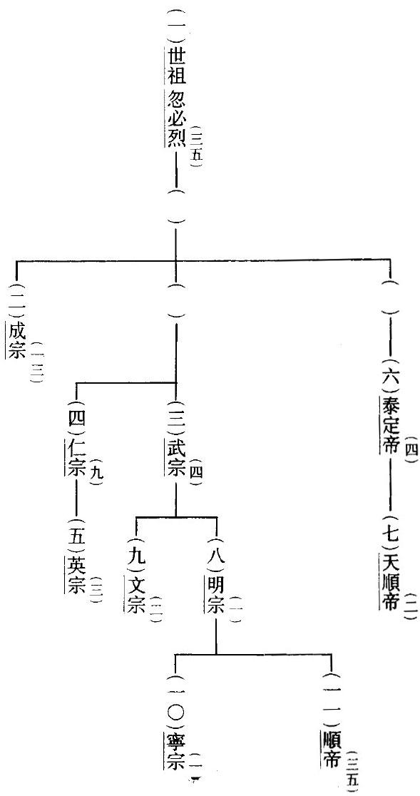 此下因蒙古未有早定储之制度,帝位相续,均由诸王拥戴,故屡起纷争。“此自宁宗、世祖时已然。武宗以下,权臣负拥立功,擅威福者三十年。直至顺帝而国亡。”